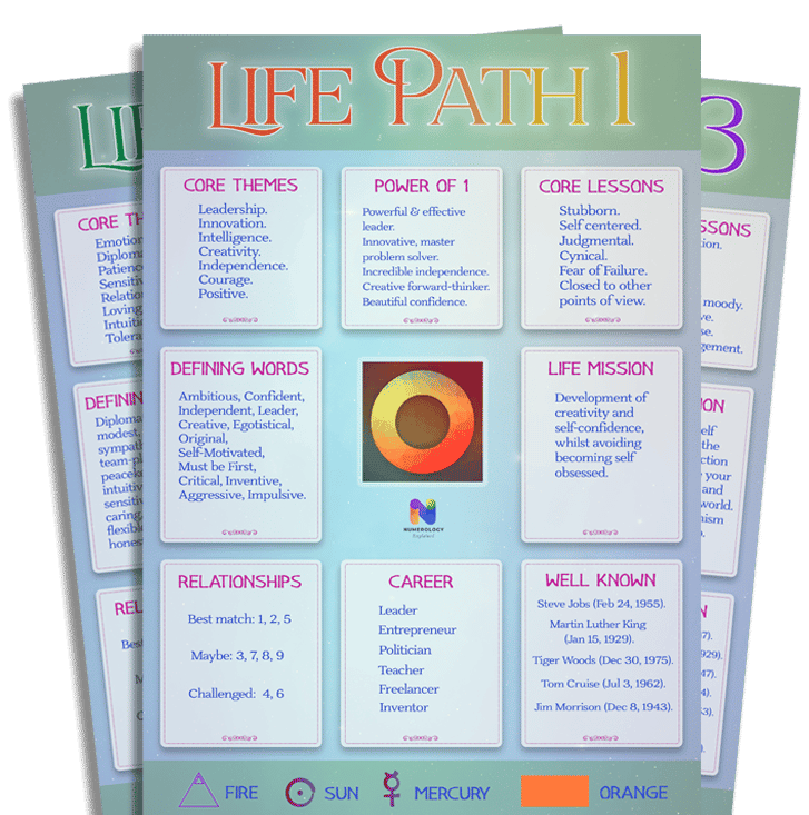 This carefully curated infographic collection to the life path numbers 1 through 9 provides all the information you could possibly want in one convenient place, about each life path number, including: